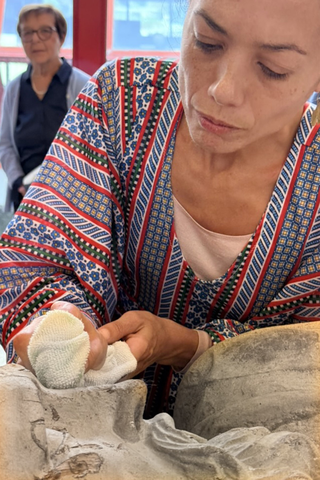 Nel corso della giornata sono stati presentati al pubblico gli intenti progettuali, segnando l’inizio di un percorso più ampio. I primi due interventi artistici hanno dato forma al dialogo: Giancarlo Norese, operando a distanza attraverso le mani di Francesca Petrolo, ha attivato una presenza remota, una trasmissione di gesti e intenzioni; Diana Dorizzi ha invece agito direttamente sul volto di Ercole, con un’opera site-specific che ha trasformato la sua fisionomia in soglia sensibile.
